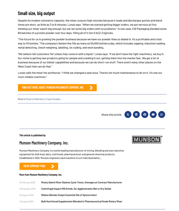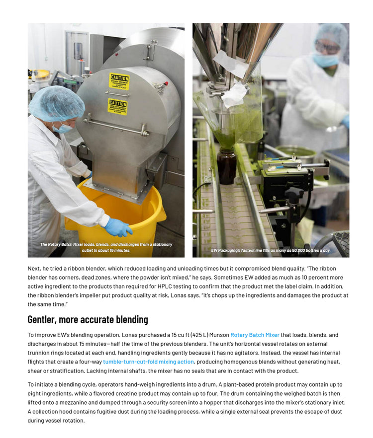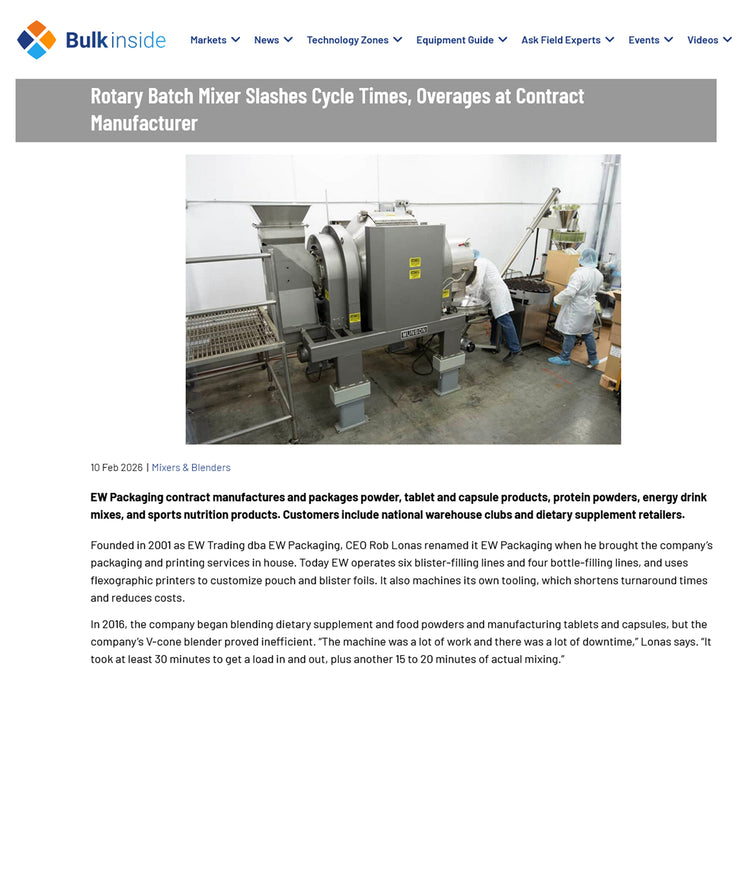When EW Packaging switched to a Rotary Batch Mixer, the Los Angeles contract manufacturer cut blending time in half and slashed ingredient overages from 10 percent to just 2-3 percent.