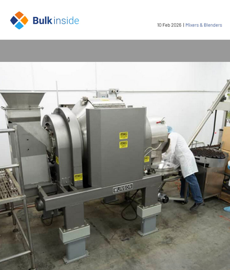 To improve EW's blending operation, Lonas purchased a 15 cu ft (425 L) Munson Rotary Batch Mixer that loads, blends, and discharges in about 15 minutes—half the time of the previous blenders. The unit's horizontal vessel rotates on external trunnion rings located at each end, handling ingredients gently because it has no agitators. Instead, the vessel has internal flights that create a four-way tumble-turn-cut-fold mixing action, producing homogenous blends without generating heat, shear or stratification. Lacking internal shafts, the mixer has no seals that are in contact with the product.